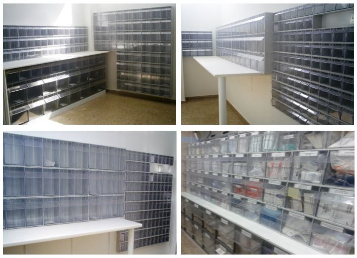A la entrada del almacén se decide poner contenedores basculantes pequeños para medicación y unidosis, a continuación un banco de trabajo y contenedores basculantes medianos para vendas, apósitos, etc... En la pared de enfrente debajo del mostrador contenedores basculantes grandes para productos voluminosos, y encima del mostrador más contenedores basculantes de tamaño intermedio para otro tipo de material farmacéutico.